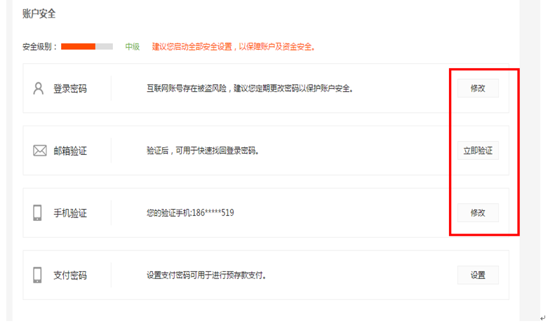 您可以登陆“账户安全”通过设置邮箱验证,支付密码来提高账户的安全等级。