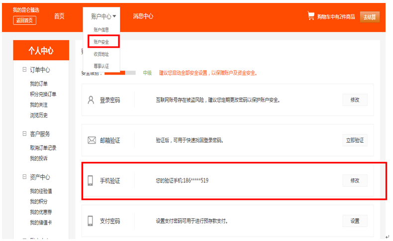 登录会员账户,在“会员中心—账户中心—账户安全”里,可以完成手机验证。