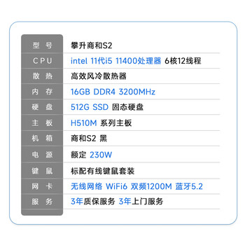攀升商和S2 办公商用台式电脑全套整机(11代i5-11400 16G 512G WiFi6 键鼠 3年上门)单主机diy组装机