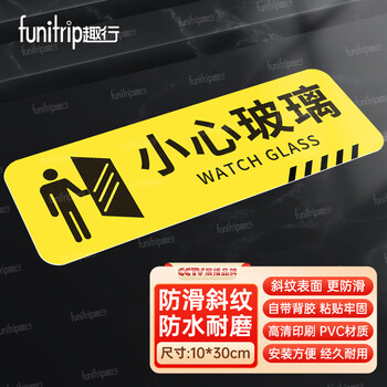 趣行PVC警示地贴墙贴 斜纹防滑耐磨警告标识不干胶贴牌 30CM 小心玻璃